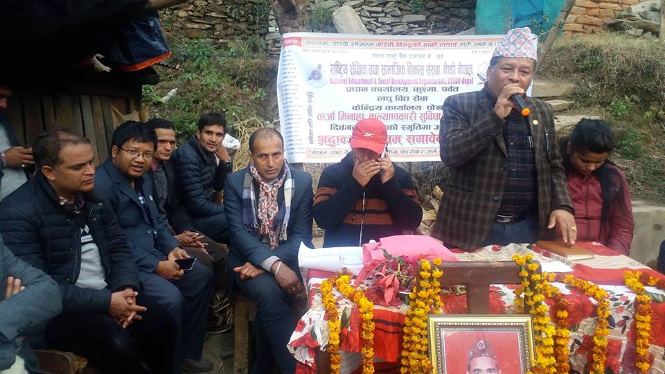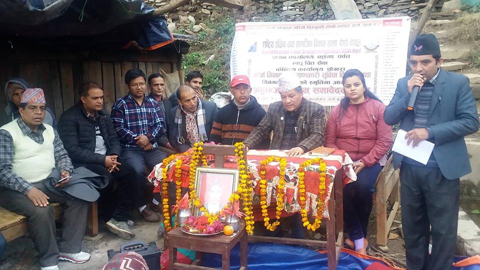 पर्वत जिल्लामा विपन्न, महिला तथा सामाजिक वन्चितीमा परेका वर्गको चेतना, संगठन, आयआर्जनको साथै ससक्तिकरणको क्षेत्रमा क्रियाशिल राष्ट्रिय शैक्षिक तथा सामाजिक विकास संस्था, नेष्डो नेपाल र अमरटिका शिक्षा, स्वास्थ्य एवम् सामाजिक विकास प्रतिष्ठान, अमरटिका फाउण्डेशनले संयुक्त रुपमा सो कार्यक्रमको आयोजना गरेका हुन । गत माघ ३ गतेका दिन पर्वत जिल्लाको मालढुँङ्गामा भएको वस दुर्घटनामा संस्थाका सदस्य वुधी परियारका श्रीमान् टिका परियार र उनकी कान्छि श्रीमति सेती परियार लगायत ७ जनाको दुखद निधन भएको थियो ।